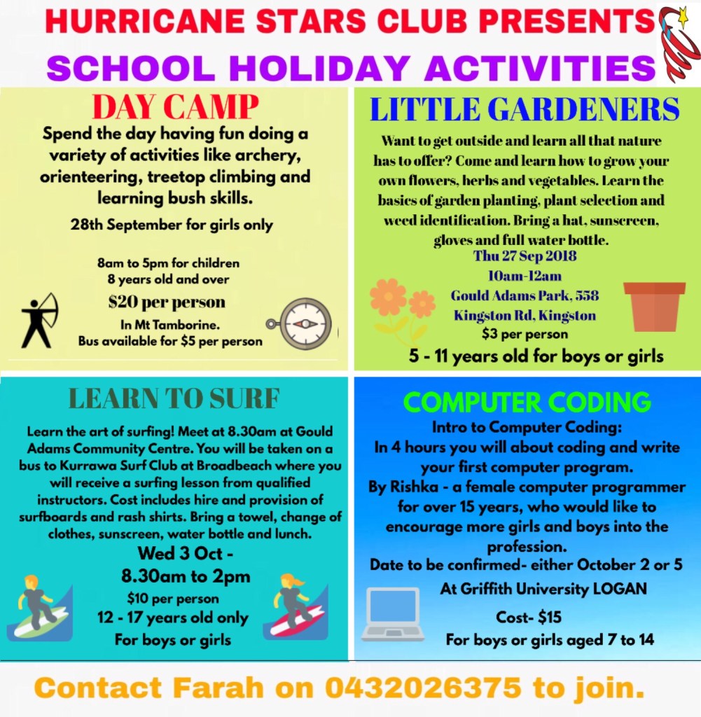 Since 2015 Hurricane Stars Club, previously called the Young Amirs Club, has organised monthly activities and school holiday programs for children and families to have fun, make new friends and learn something new. We started activities especially for teenagers to get them off their electronic devices and out of the house, having fun and socialising with their peers. In 2018 we officially registered the Hurricane Stars Club as an incorporated organisation. We are honoured to have been chosen by Brisbane City Council to run programs for their Chill Out school holiday program for Youth Week. We have also been chosen as a provider by Logan City Council for their Krank school holiday program.